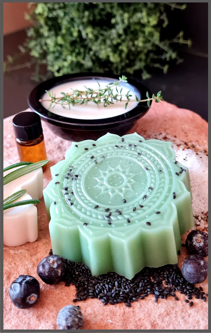 Zaļās ziepes: Ar maigu smaržu. Lai atbrīvotos no svešām vibrācijām un var lietot kā rokas ziepes ikdienā. Ziepes satur augu ekstraktus, eļļas un citus dabiskos elementus. Ziepes ir pazīstamas ar savu spēju absorbēt un attīrīt negatīvo enerģiju, tādēļ tās ir ideālas lietošanai cilvēkiem, kuri vēlas aizsargāt sevi no ārējām enerģijām. Svarīgi ir arī rūpīgi uzraudzīt savu emocionālo un enerģētisko stāvokli, lai nodrošinātu savu labsajūtu un aizsardzību pret nevēlamo ietekmi. Ziepes satur - Litseja, kadiķi un citus dabīgus elementus. Litsea cubeba pazīstama arī kā May Chang, nosaukta ķīniešu Dievietes vārdā. Šī eļļa palīdz nomierināt prātu un enerģētiskā līmenī veicina tuvību un dziļu vienotības sajūtu ar visu apkārtējo. Dieviete May Chang simbolizē aizsardzību, sirsnību un mīlestības pilnu klātbūtni. Kadiķis - enerģētiski sargā no negatīvām vibrācijām. Sandalkoka ēteriskā eļļa ir spēcīgs aromterapijas līdzeklis aizsardzībai, kas nomierina prātu un mazina stresu.